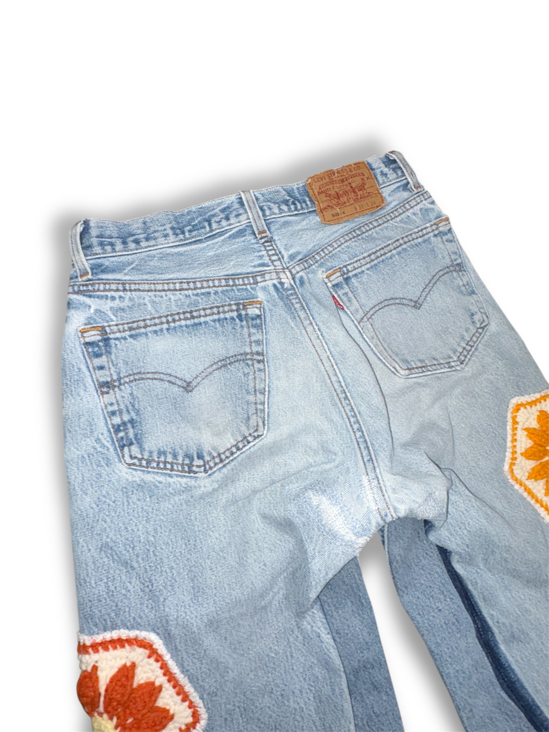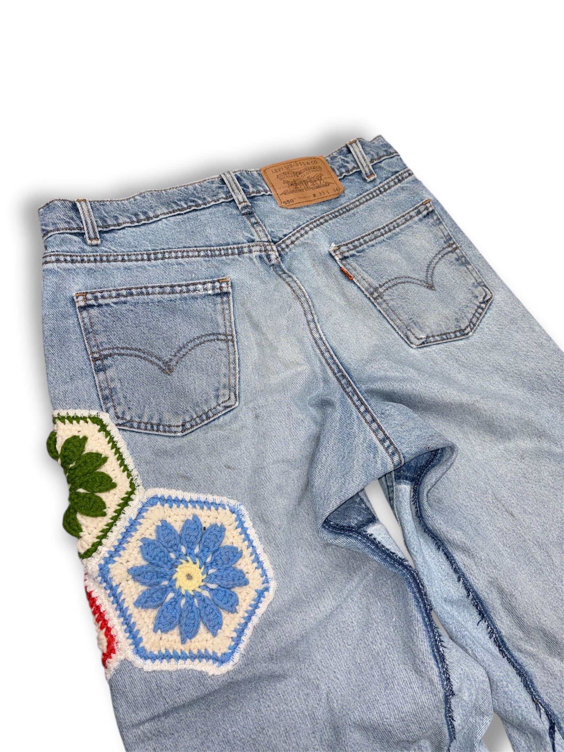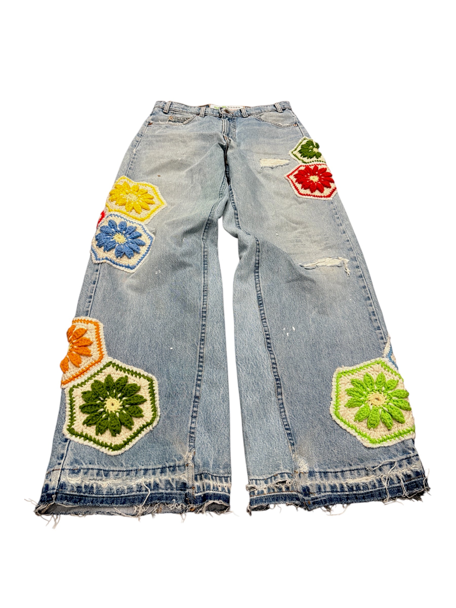 Each 1 of 1 pair comes with a unique wash and layout of hand crochet hexagon “granny squares”. Every pair has a custom inner inseam flare to give a very nice raw silhouette with undone hems with a proper stack.