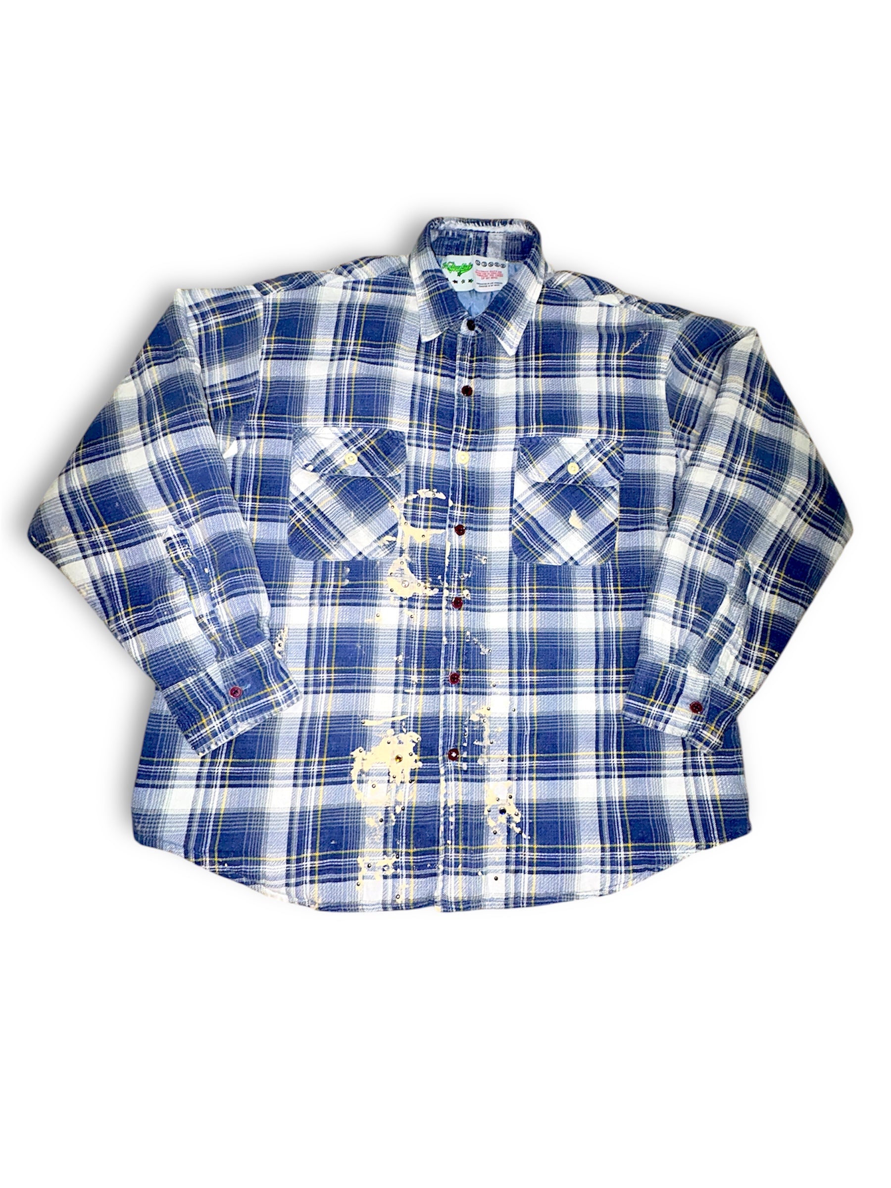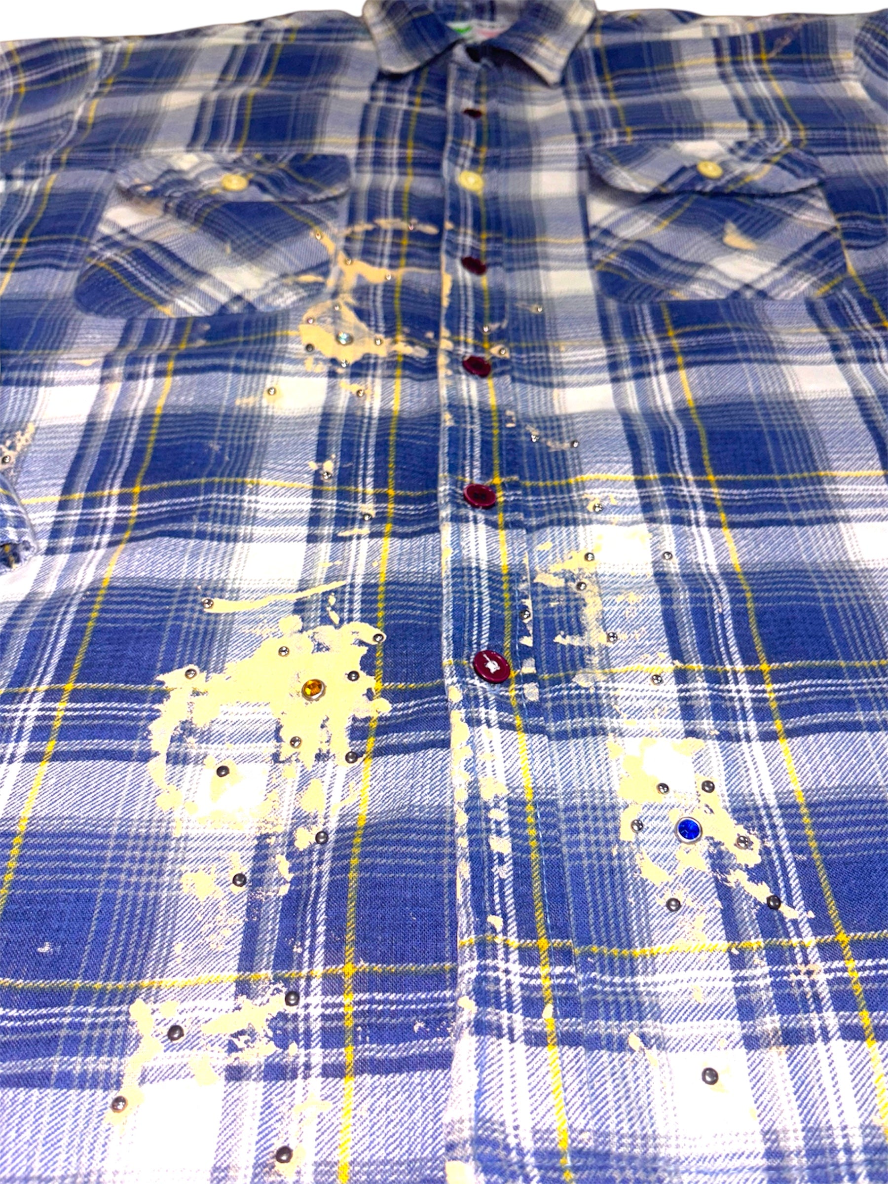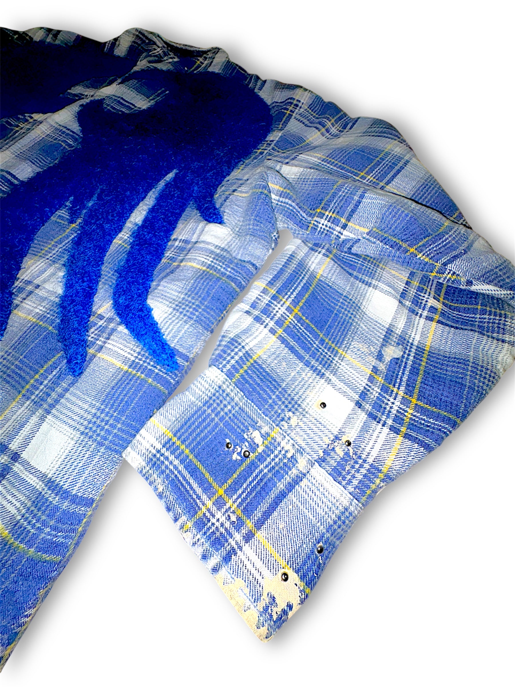 1 of 1 flannel. First ever in this blue color way with hand placed metal studs. Specially picked vibrant blue 100% mohair wings. Size is a 2XL but can fit all.