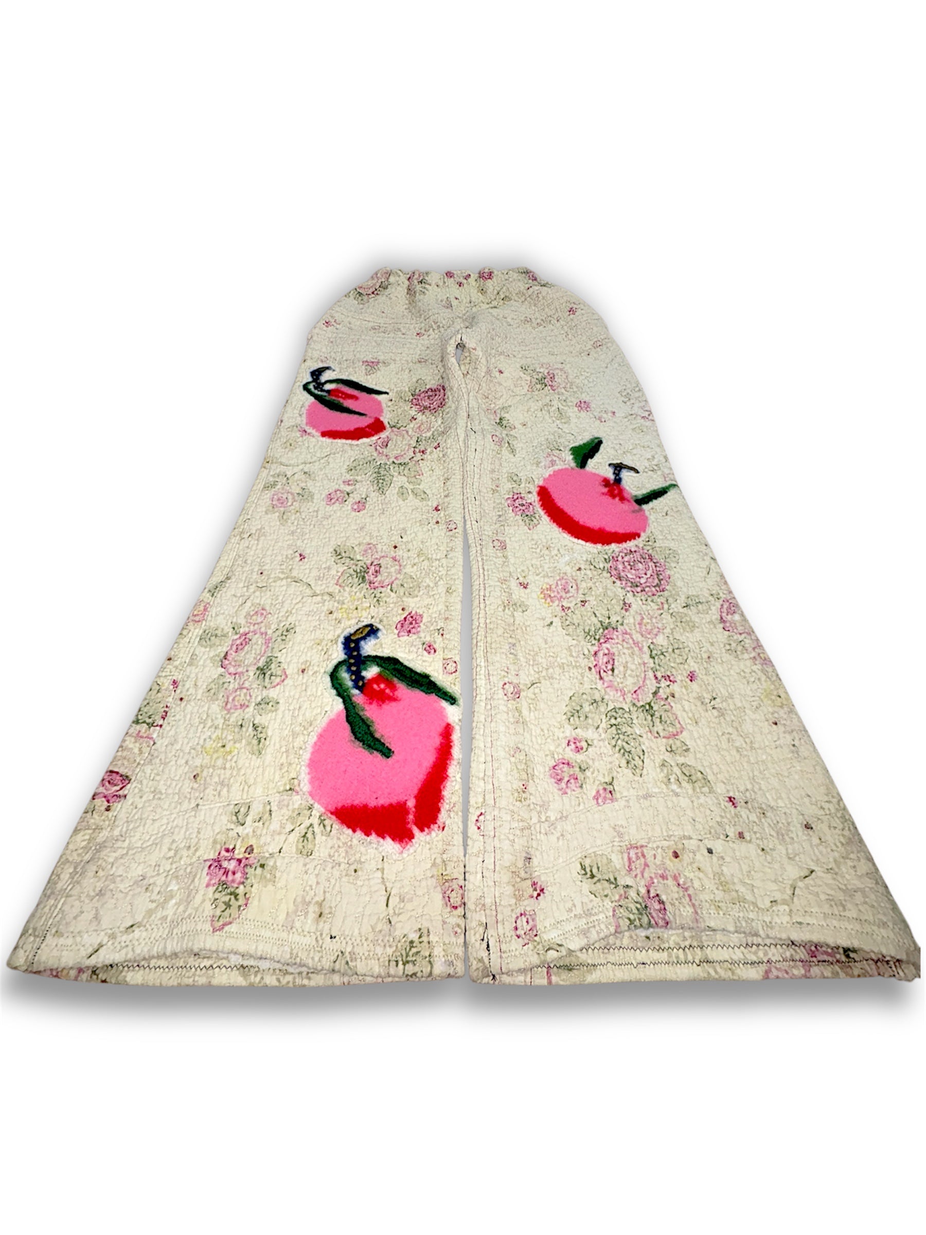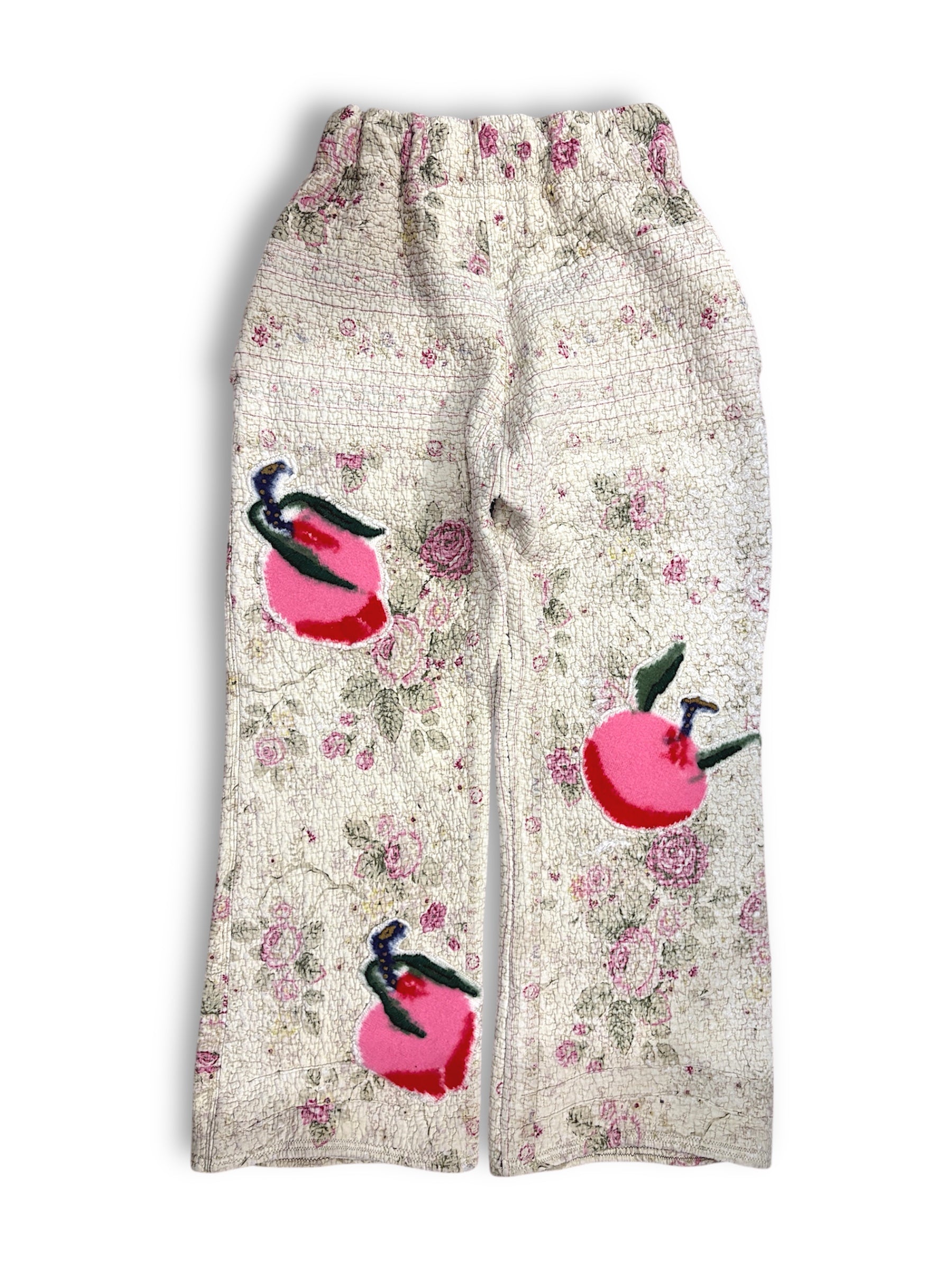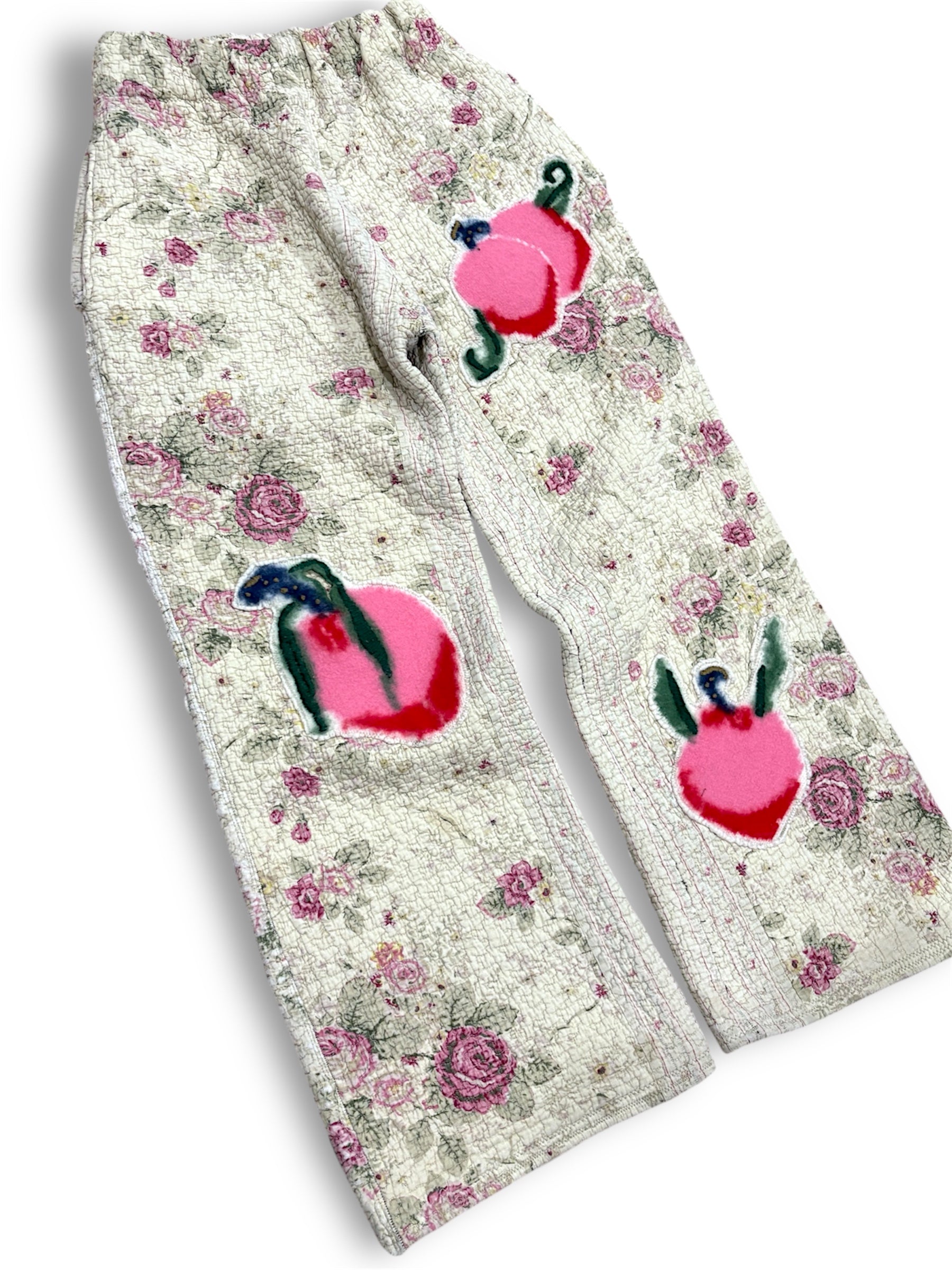 Custom made pattern from in house cut n sewn decorative knitted peach fabric with subtle distressing all through out. Super comfy.